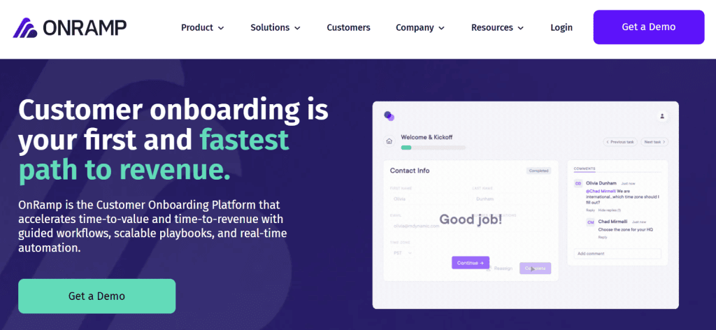 OnRamp helps your team build stronger relationships right from day one, which makes it a pretty good choice for B2B teams focused on retention, expansion, and smooth customer experiences, and not just getting clients through the door.