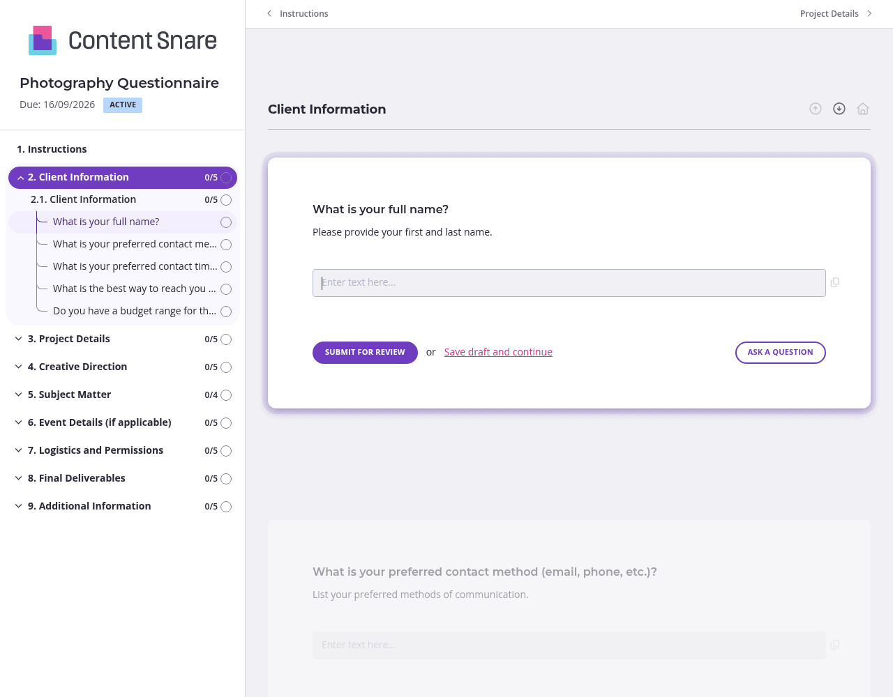 Photography questionnaires can overwhelm clients when they see 40+ questions at once. Content Snare lets you split questions into logical pages - Client Information, Project Details, Creative Direction, Event Details, and Final Deliverables. Clients complete one section at a time, hit next, and maintain momentum instead of abandoning halfway through.