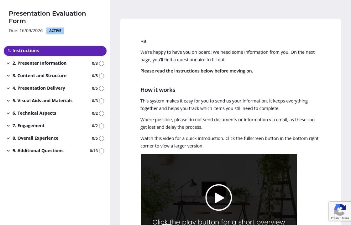 Group your evaluation questions into clear sections: Content and Structure, Presentation Delivery, Visual Aids, and Overall Experience. Participants can focus on one aspect at a time rather than facing a wall of questions. The form feels shorter and more manageable, which means higher completion rates and more thoughtful answers.