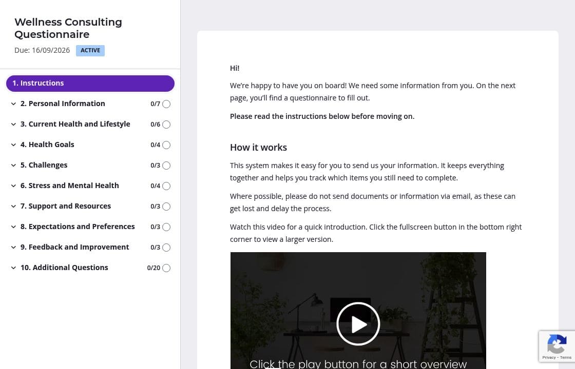 The stress and mental health section asks personal questions. Some clients will wonder how much detail to share or whether their answers stay confidential. Add brief instructions at the top of sensitive sections to set expectations: "Your responses help us personalize your plan - everything shared here remains confidential." A short video explaining how you'll use their health information can also ease concerns and improve response quality.