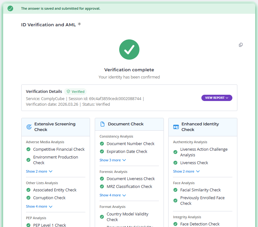 The verification details show the provider (ComplyCube), session ID, verification date, and a Verified status badge.