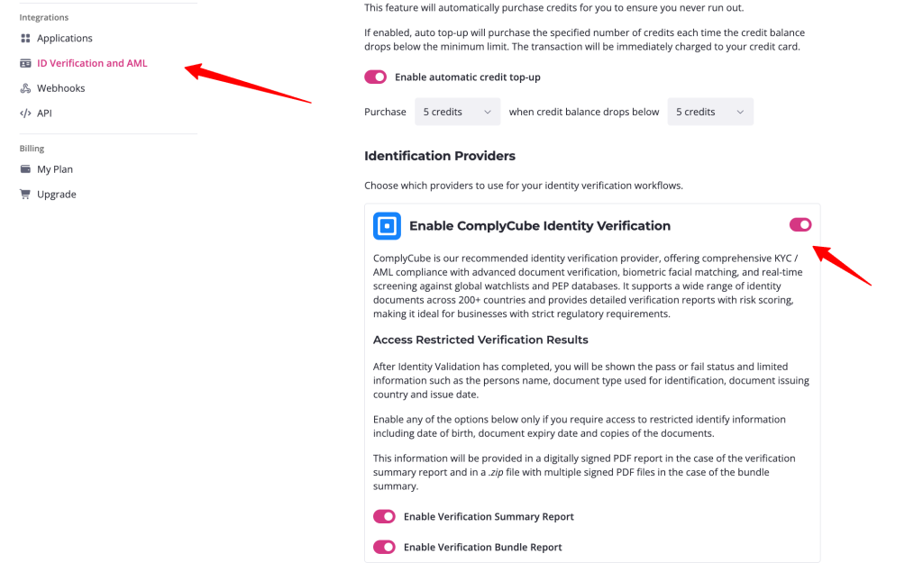 Before adding verification fields to your requests, you need to enable ComplyCube in your account settings.