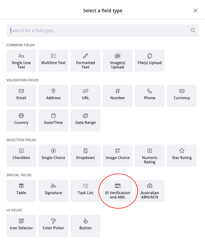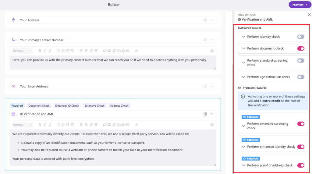 In the request builder, add an ID Verification and AML field to any page or section, just like any other field type.