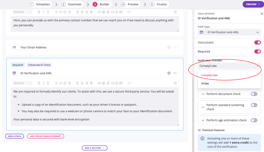 With the field selected, open the field settings panel. Under Verification provider, select ComplyCube.