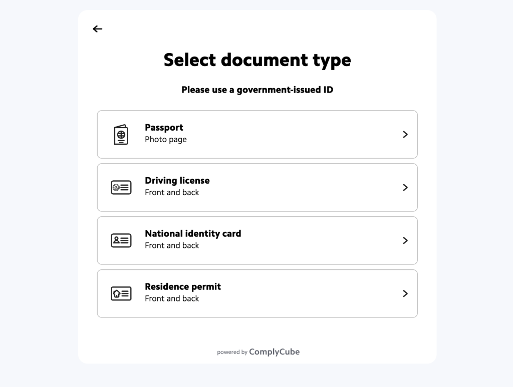 ComplyCube accepts government-issued identity documents including passports, driver’s licences, and national ID cards from countries worldwide.