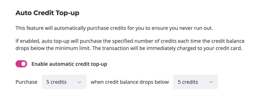 If you don’t have credits available, the system will display a warning and prompt you to purchase more. You can also enable automatic credit top-up in your settings to purchase new credits automatically when your balance drops below a set number.