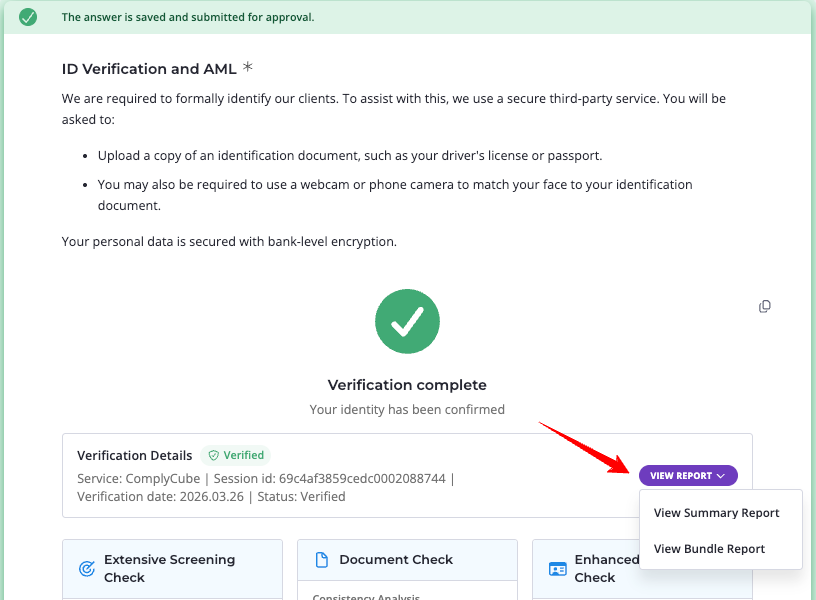Bundle report: A comprehensive PDF containing the full results of every database checked, plus the source documentation (selfie photos, ID document images, extracted data). This report contains highly sensitive personal information and should be stored and shared securely in line with your firm’s data handling policies.