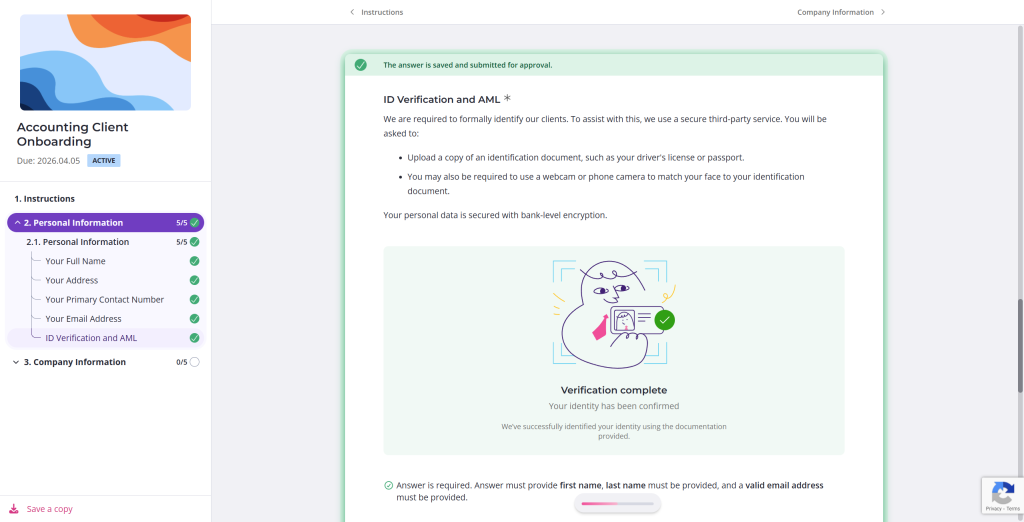 The system may take a moment to complete the verification. You’ll see a notification that your client’s identity is currently being verified. This usually resolves within a minute.