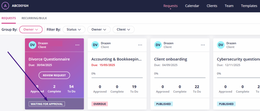 By default, requests enter the “Waiting for Approval” status as soon as a client submits the first answer. However, you can decide exactly when this status change happens: