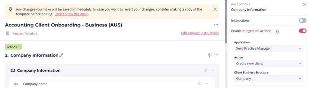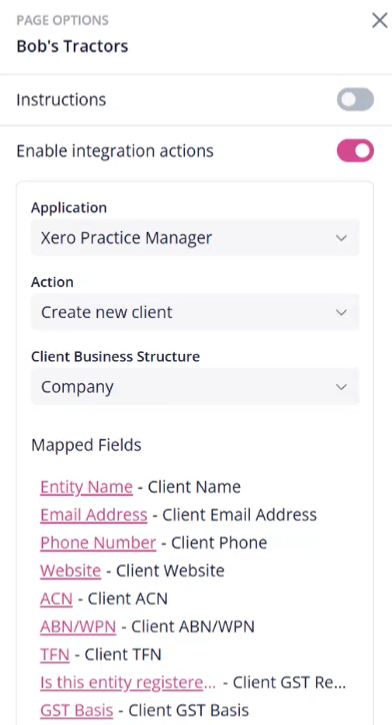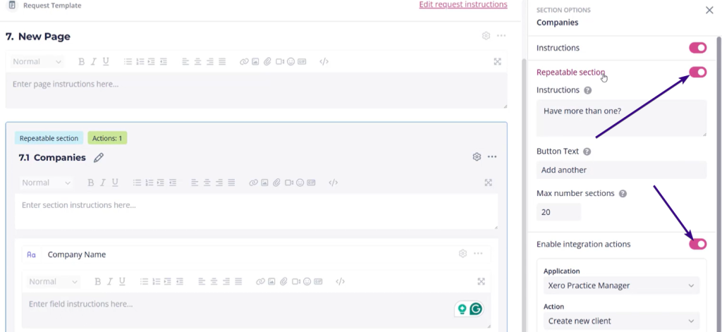 For example, you could have a section called “Companies” that is mapped to a new client in XPM. The client can then “repeat” that section to create 10 companies, which all push into XPM.
