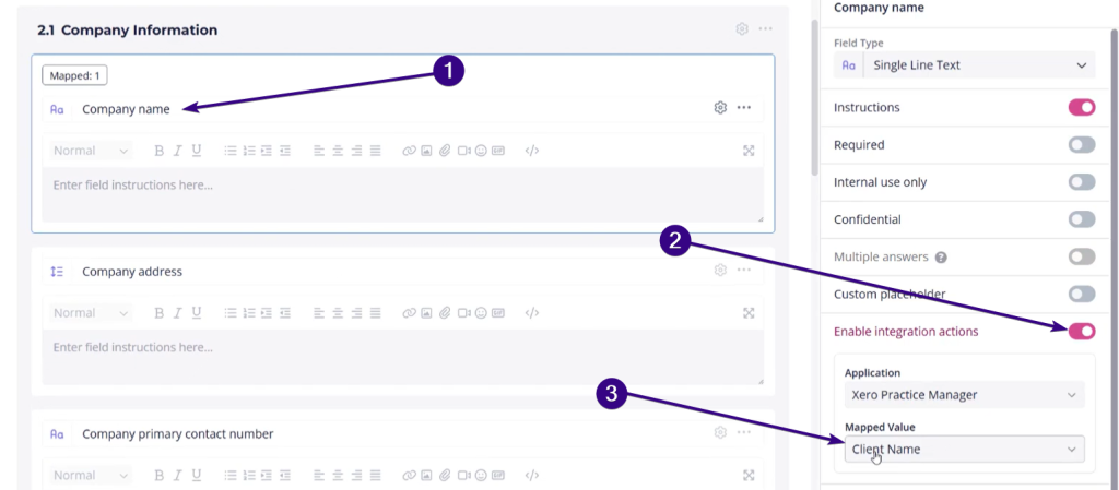 For example, if you ask for “Company Name” in your form, you can map that to the “Client Name” field in XPM:
